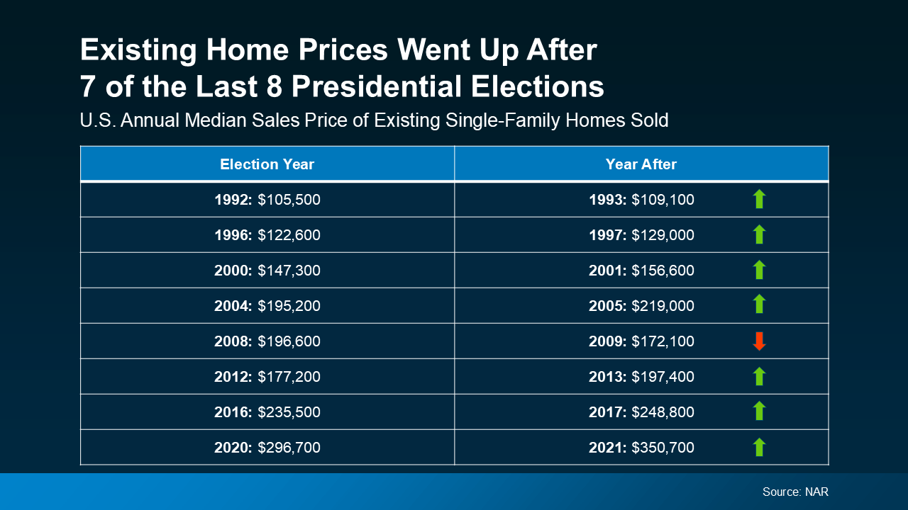 While it’s natural to feel a bit uncertain during an election year, history shows the housing market remains strong and resilient. And this means you don’t have to pause your plans in the meantime. For help navigating the market during this election cycle, let’s connect.